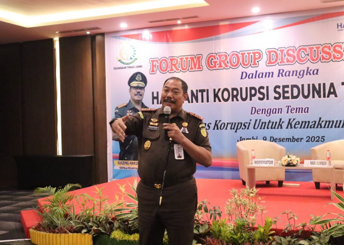 JAMBI, JAMBITV.CO – Dalam rangka menyambut Hari Anti Korupsi Sedunia (HAKORDIA) 2025, Bidang Tindak Pidana Khusus Kejaksaan Tinggi Jambi menggelar Forum Group Discussion (FGD) dengan tema “Berantas Korupsi untuk Kemakmuran Rakyat”. Kegiatan berlangsung di Hotel BW Luxury Jambi pada Selasa (9/12/2025).